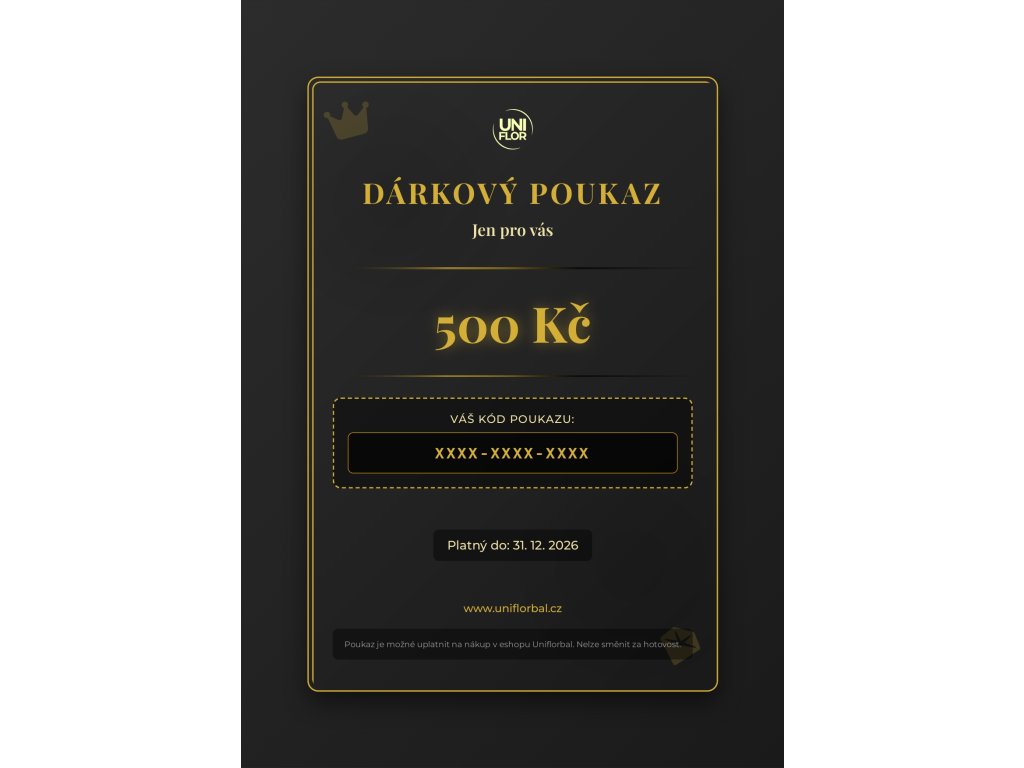Dárkový poukaz platí na nákup zboží na e-shopu Uniflorbal. Při nákupu na něj nejde uplatnit žádná sleva. Použití je jednorázové a vyplacení zbylé hotovosti není možné.