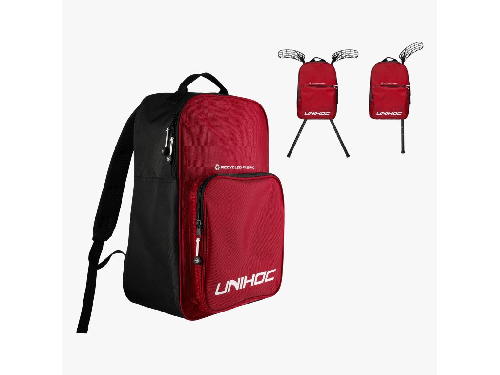 Sportovní batoh Unihoc Classic Red 25L je vybavený dvěma kapsami na zip. Vyrobený je z recyklovaného polyesteru a obsahuje poutko na dvě florbalové hole. Polstrovaná záda, nastavitelné ramenní popruhy a poutko na pověšení.